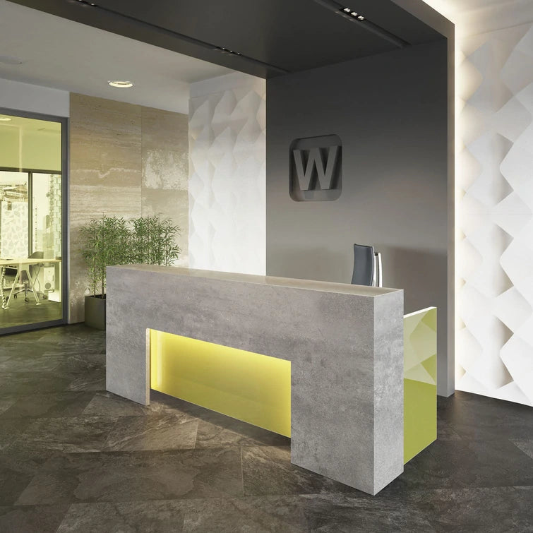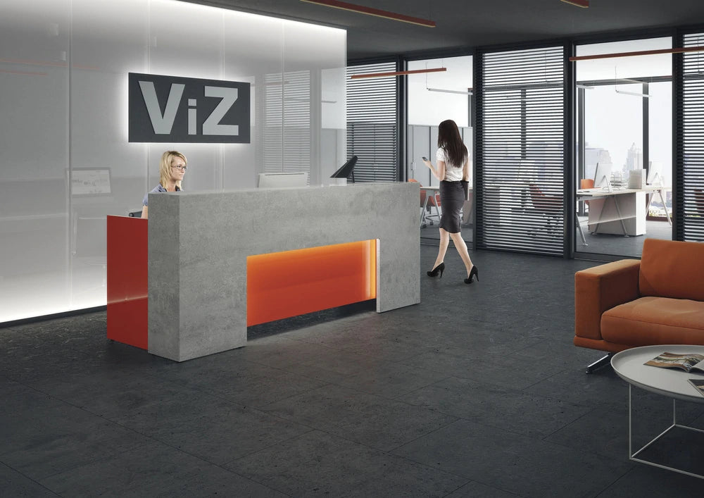 BLOCK reception unit draws attention with its remarkable appearance, and at the same time it creates the atmosphere of concentration. The front of the counter is composed of two layers. The first is a strong frame with a colour of concrete. Behind it, there is a colourful surface illuminated by RGB LED lamps. Light emanating from inside the frame underlines the depth of the structure. The lamps have the function of generating a wide range of colours. They can be easily controlled by a remote control.