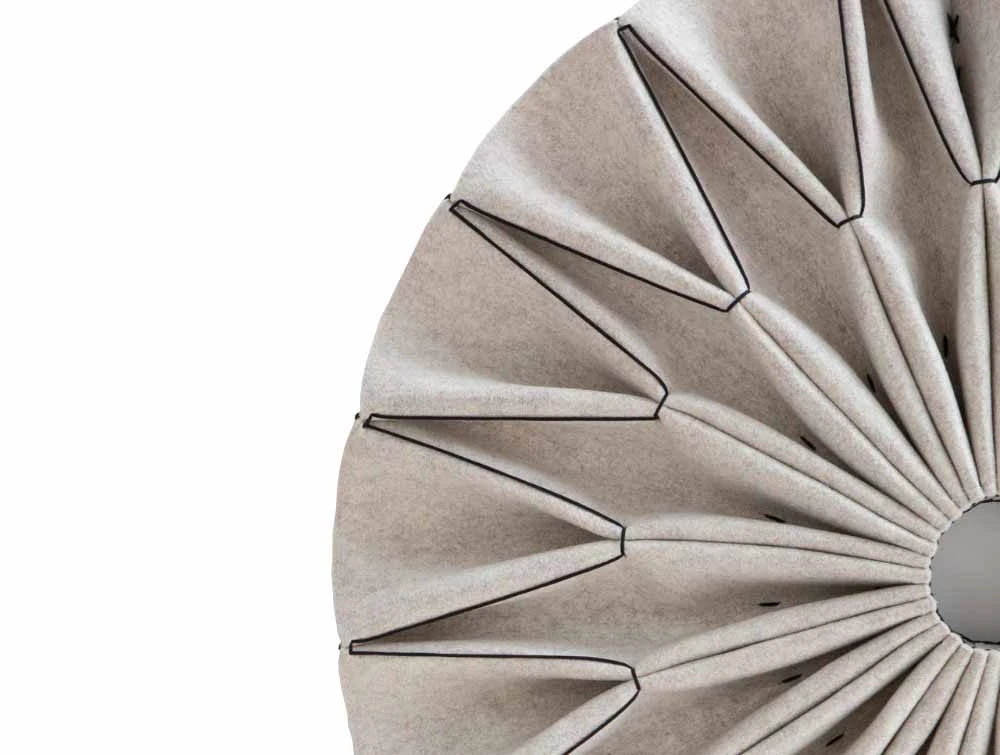 Experience the exceptional acoustic performance of BuzziPleat, delivered by its architectural folds. The large-scale, yet lightweight sculptural forms can be suspended from the ceiling or wall-mounted. This series reinterprets ancient techniques used in fashion design, like smocking and pleating, to gather up volume for acoustic purposes. The traditional craft of hand pleating and lacing, which requires a steady hand and eye for detail, takes more than 2 hours for each BuzziPleat.
