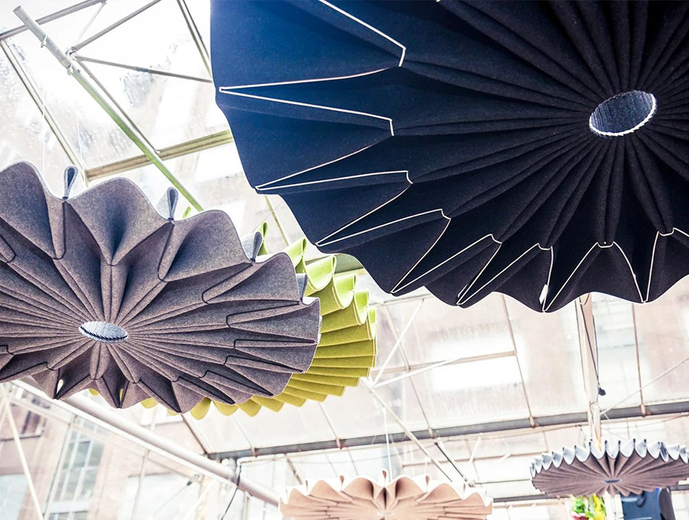The design BuzziPleat Ripple pendant ceiling light provides lighting and silence at the same time. The acoustical performance is from the handmade folds. The product is equipped with BuzziSol, a powerful LED light source.