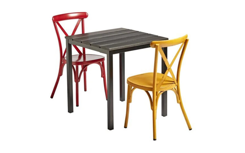 Red and yellow vintage chair: Cross back stacking side chair, available in for colours. Certified for severe contract use in a beautiful aluminium vintage-finished frame - suitable for indoor and outdoor use. Distressed finish - the vintage effect may vary. Eko black table: The very sturdy design dining table. Base powder coated black for outdoor use, complete with the highest quality EKO top. EKO looks exactly like wood but is made from recyclable material. It requires no painting or maintenance throughout its 50+ year life. The table may also be used internally if required.
