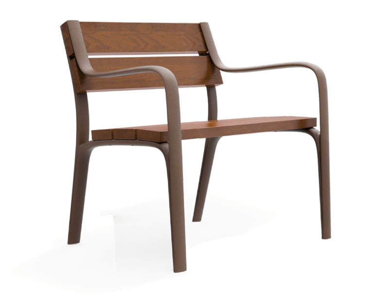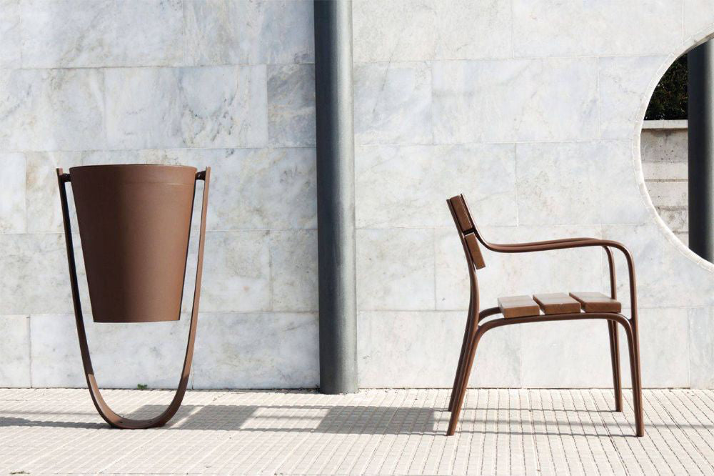 The Citizen Wooden Outdoor Chair, which combines comfort and modern design with an organic, nature-inspired aesthetic, is a piece from Eugeni Quitllet's first street furniture line. Its five tropical wood planks are coated with Lignus to assure durability, and its ductile iron legs are ferrus-treated to prevent corrosion. M10 bolt anchoring is advised, and protection is increased with epoxy and Marson coatings.
