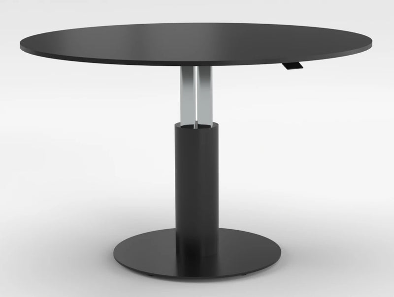 Follow is a height-adjustable table that effortlessly and noiselessly adjust to the user's posture and needs. The meeting version with a painted steel frame and round top available up to 1600 mm in diameter, is ideal for meetings in office spaces but can also be used in meeting areas and convivial areas. Chromed height adjustment column and handle in reinforced nylon. A table that can be placed and moved anywhere: it is not connected to any cable as it does not need any electricity supply.