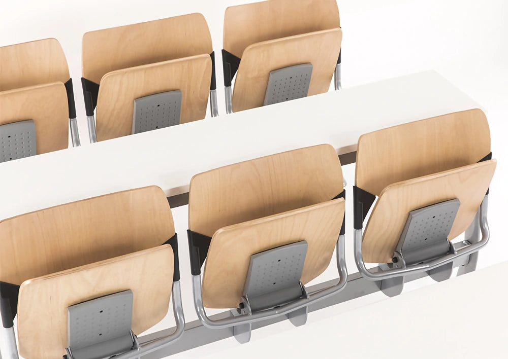 Gate Monoblock is a system of banks and seats, fully customizable, and ideal for university and convention halls. The seats are equipped with a tilting mechanism with a special braking system that cushions the return movement. Feet for floor fixation can be adapted to both straight, stepped as well as sloping floors.