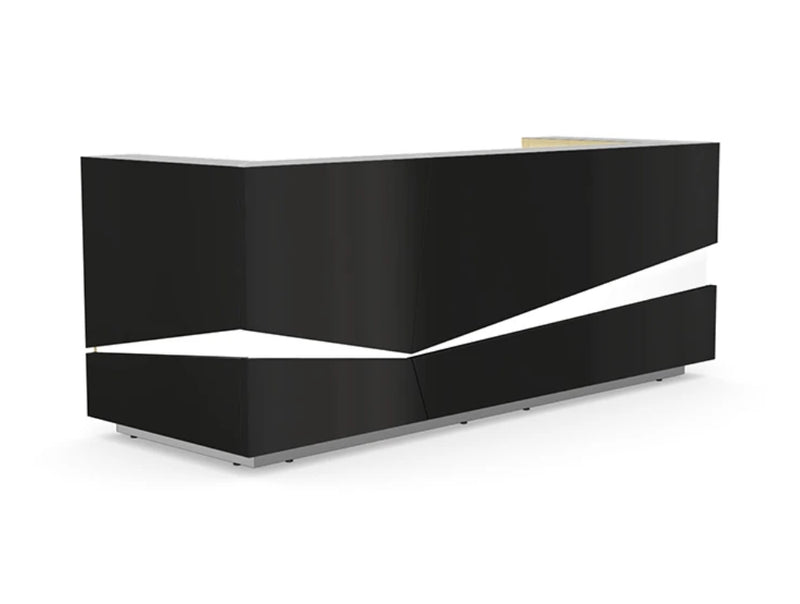 ILLUSION reception unit is the quintessence of expressive and dynamic form. A form that attracts and fascinates. The compact body is cut by two slots - one slotted horizontally, the other vertically. The gaps create visual effect of depth, additionally light comes out from behind the glass filling the gaps. The illumination is created by the RGB LED lamps. The lamps have the function of generating a wide range of colours. They can be easily controlled by a remote control. Applying different colours of finish and light, we can achieve a completely different final result- the reception can have a futuristic character or - on the contrary - refer to classic elegance.