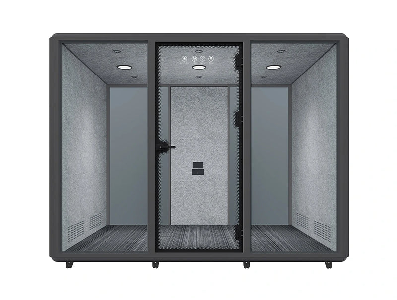 The Silentium 6-Person Meeting Pod in Slate Grey offers a stylish and functional solution for private meetings and collaboration. Built with a 3.5mm slate grey aluminium shell and 10mm thick tempered glass, it provides a quiet, comfortable space with 31dB rated sound absorption. The pod features 15mm thick acoustic panels, adjustable fresh air circulation, and low operational noise, ensuring comfort and productivity for extended periods. Equipped with 4000K natural lighting, PIR sensor, and independent light and fan control, the pod is energy-efficient and well-ventilated. USB, Ethernet ports, and 3-pin plug sockets come as standard, making it a fully equipped, modern meeting space.