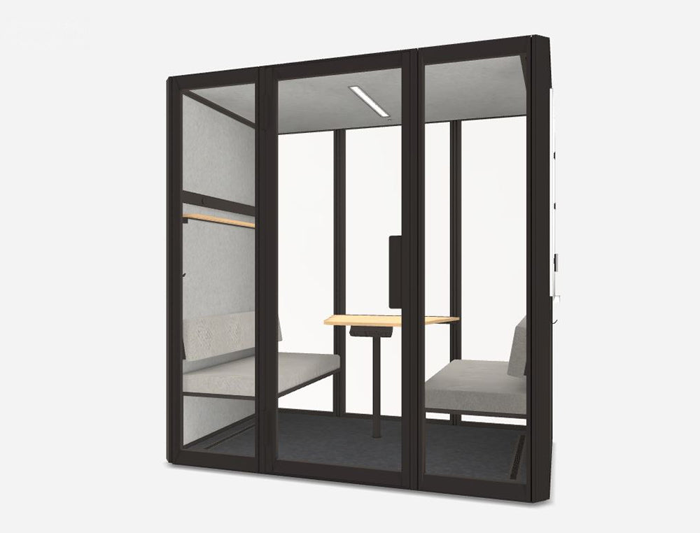 An acoustic oasis for one. Step inside for a quick call, video meeting, or deep work session to come up with the next big idea. Use extra add-on sets for even more functionality. Add bookshelves or a whiteboard anywhere and at any height, inside or out. Your office needs a slight refreshment? Simply reconfigure your add-ons. Its walls can be either black or white, but Jetson is always green at its core. Several innovations make it the most earth-friendly pod on the market.