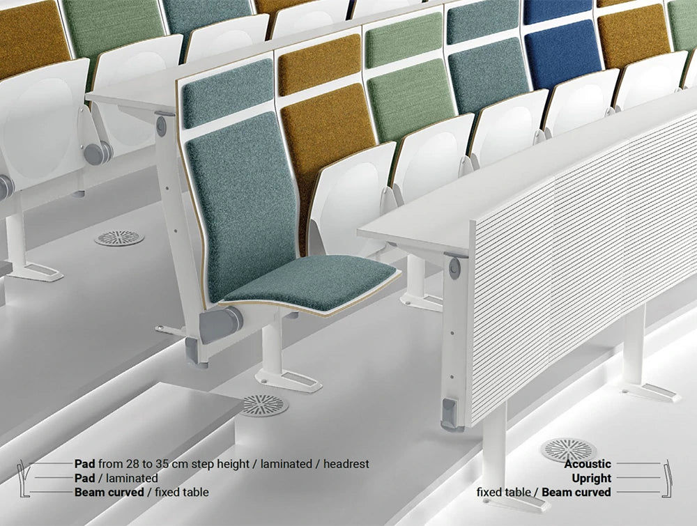 Omnia Evolution is a modular table and chair system designed to maximise seating capacity while ensuring superior comfort and ergonomics. Adaptable to flat, curved, stepped, or sloping floors, it offers flexible configurations for any learning or conference space. The tables feature an efficient anti-panic folding mechanism for safety, durability, and ease of use.