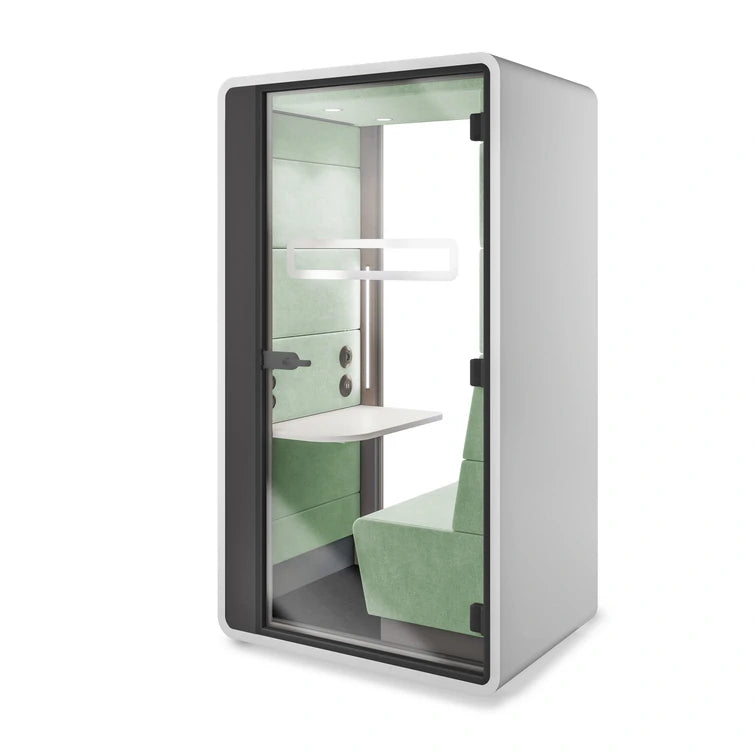 HushHybrid is a solution dedicated to individual work in focus and longer videoconferences, as well as online training and webinars. The cabin has a comfortable, soft seat that helps to maintain an upright body position, and the handle mounted in the product allows you to hang an all-in-one computer or a monitor. Additional side LED strips provide favourable facial illumination during video calls. The depth-adjustable table top on the inside allows you to adjust the depth for your convenience. HushHybrid is characterized by good sound insulation, which provides excellent conditions for performing tasks. The cabin can be ordered with additional stickers on the glass, ensuring privacy, thanks to the "frosting" effect. The combination of these properties creates a universal place for hybrid work, which, in addition to great design, allows you to perform tasks in peace and quiet.