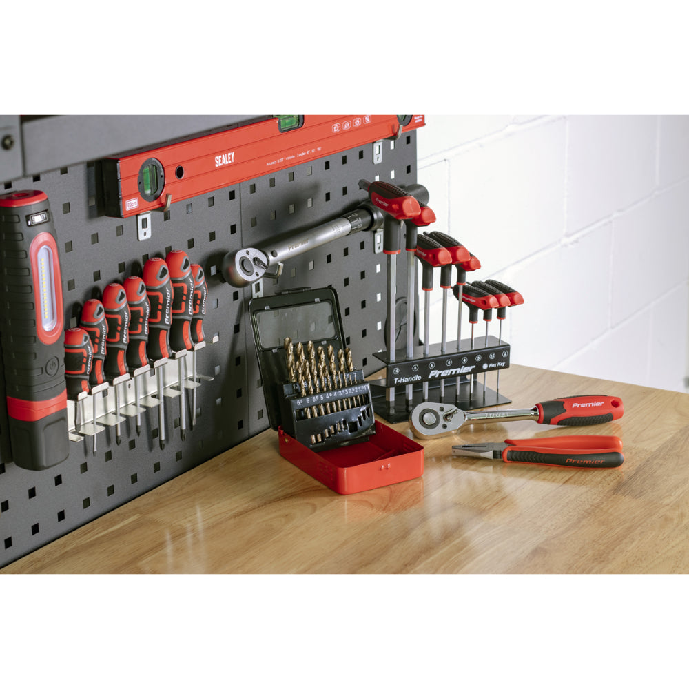 Premium mobile workstation built for busy garages and industrial workshops. Constructed from heavy-duty steel with reinforced inner walls and a rust-resistant black crinkle finish. Features a 25 mm thick rubber-wood worktop, four large Ø125 mm castor wheels (two swivel with brakes) for mobility, ten soft-close drawers on ball-bearing slides, two lockable cupboards and a back peg-panel for tool organisation.