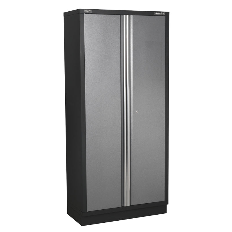 A full-height floor cabinet, 915 mm wide by 460 mm deep by 2000 mm high, with double doors and four fully adjustable shelves. Includes a high-quality lock with two keys and is supplied flat-packed for ease of transport. Ideal for workshops or garages, it can be used standalone or combined with a modular storage system.
