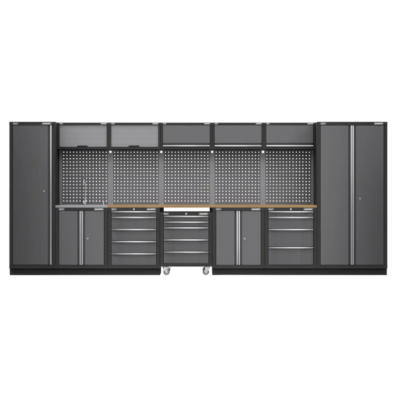 Package includes: Model No. – Description, APMS56 - Modular Full Height Floor Cabinet 2 Door 915mm, APMS54 - Modular Wall Cabinet Tambour Front 680mm (x2), APMS53 - Modular Wall Cabinet 680mm (x3), APMS59 - Modular Cabinet 5 Drawer 680mm, APMS52 - Modular Floor Cabinet 2 Door 680m, APMS58 - Modular Mobile Cabinet 5 Drawer 650mm, APMS51 - Modular Cabinet 4 Drawer 680mm, APMS55 - Modular Full Height Floor Cabinet 600mm, APMS67 - Modular Sink Unit 680mm, APMS50BP - Modular Back Panel 615mm (x5), APMS50UCD - Modular System Double Upright Connector (x4), APMS50UCS - Modular System Single Upright Connector (x2), APMS50WC - Pressed Wood Worktop 2040mm, APMS50WA - Pressed Wood Worktop 680mm.