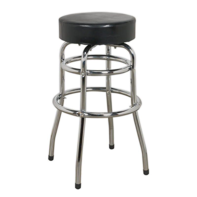 Robust workshop stool designed for mechanics and trade professionals: heavy-duty steel 4-leg base with polished chrome plate finish for corrosion resistance. Features dual strengthening rings (lower ring doubles as a foot rest), fixed height of 750 mm, and a 350 mm diameter padded seat that swivels a full 360° for ease of movement and comfort in busy workspaces.