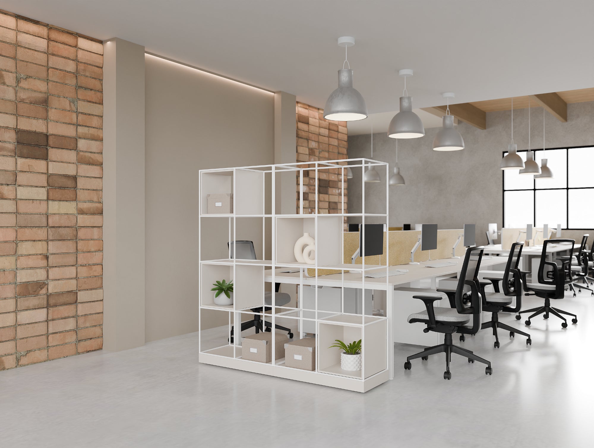 Discover the Ws.D Ionic Modular Storage, an adaptable and stylish solution for any space. Available in a choice of grid finishes - black, white, brass, and copper - this system is fully modular, allowing you to create bespoke designs with our 3D configurator. Build your storage using grid blocks in cubes or double cubes, perfect for crafting bookshelves, storage units, media units for meeting rooms, and innovative furniture for zoning spaces. Ideal for open-plan offices, the Ionic system effortlessly separates workspaces from breakout areas and can be tailored to suit home offices, libraries, and conference rooms. Personalise your design with an array of MFC wood finishes, ranging from traditional wood tones to vibrant colours. Enhance your setup with a wide selection of accessories, including plants, shelves, alcoves, and integrated storage. With Ws.D Ionic Modular Storage, the possibilities for customisation are endless, bringing both functionality and style to your environment.
