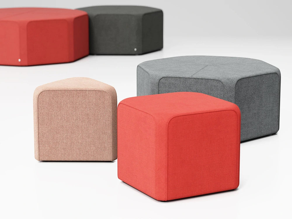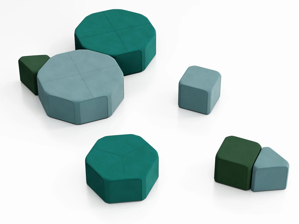 x40 is a family of for pouffes with polygonal bases. The seats have been designed on triangular, square, hexagonal and octagonal plans. The element shared by all the solids is a rectangle with rounded corners, 40 cm in width. Thanks to identical sides, the pouffes can be placed in a variety of arrangements. Based on this distinctive repetitive quality and the broad range of fabric colours, users are able to try out a variety of arrangement possibilities. The basic structural elements are styrofoam profiles covered with polyurethane foam. As a result, the pouffes are very lightweight and can be rearranged as often as you please. The x40 family is an excellent choice for furnishing public utilities and modern residential interiors.